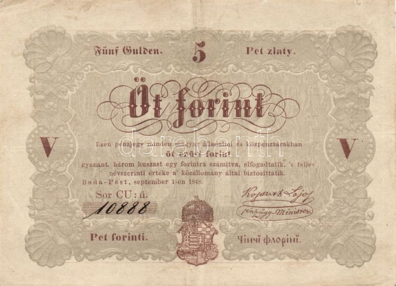 Leírás: 1848. 5Ft "Kossuth bankó" barna, hátlapi szöveg ferdén nyomva T:II