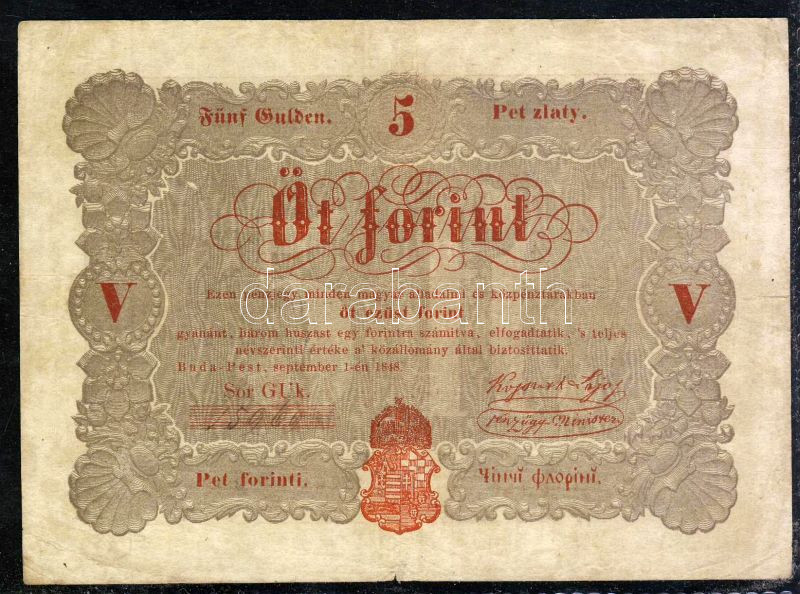 1848. 5Ft "Kossuth bankó" vörösbarna T:III- https://www.darabanth.com/hu/82-Gyorsarveres/82.0/Numizmatika/Osztrakmagyar-magyar-es-magyar-vonatkozasu-bankjegyek~248/1848-5Ft-Kossuth-banko-vorosbarna-TIII-~II172883