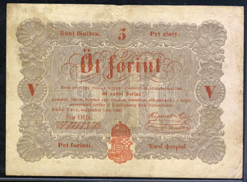 1848. 5Ft "Kossuth bankó" vörösbarna T:III+ https://www.darabanth.com/hu/82-Gyorsarveres/82.0/Numizmatika/Osztrakmagyar-magyar-es-magyar-vonatkozasu-bankjegyek~248/1848-5Ft-Kossuth-banko-vorosbarna-TIIIplus~II172875