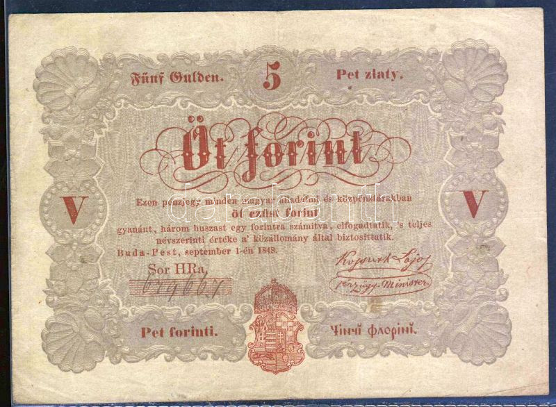 Leírás: 1848. 5Ft "Kossuth bankó" vörösbarna T:III+