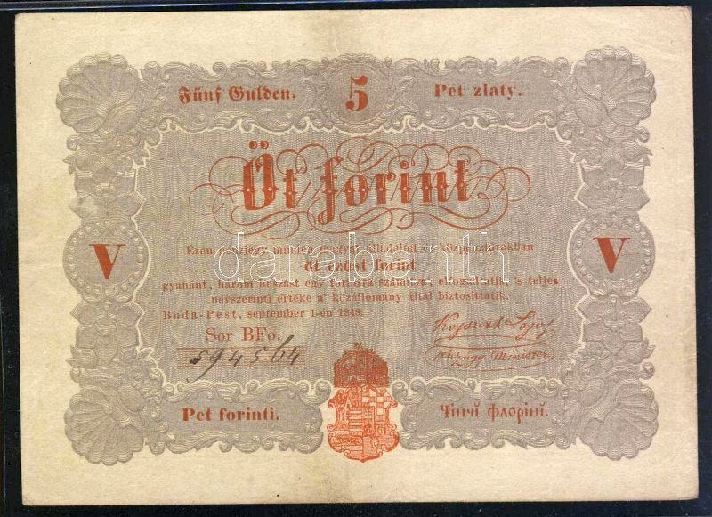 1848. 5Ft "Kossuth bankó" vörösbarna T:II https://www.darabanth.com/hu/82-Gyorsarveres/82.0/Numizmatika/Osztrakmagyar-magyar-es-magyar-vonatkozasu-bankjegyek~248/1848-5Ft-Kossuth-banko-vorosbarna-TII~II172889
