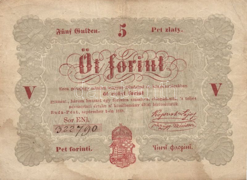 1848. 5Ft "Kossuth bankó" vörösbarna, ritkább hátlapi második sorban é... https://www.darabanth.com/hu/82-Gyorsarveres/82.0/Numizmatika/Osztrakmagyar-magyar-es-magyar-vonatkozasu-bankjegyek~248/1848-5Ft-Kossuth-banko-vorosbarna-ritkabb-hatlapi-masodik-sorban-ekezet-plus-ekezet-roman-~II172861