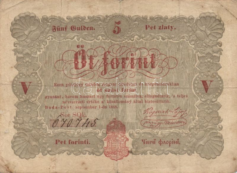 1848. 5Ft "Kossuth bankó" vörösbarna, ritkább hátlapi második sorban é... https://www.darabanth.com/hu/82-Gyorsarveres/82.0/Numizmatika/Osztrakmagyar-magyar-es-magyar-vonatkozasu-bankjegyek~248/1848-5Ft-Kossuth-banko-vorosbarna-ritkabb-hatlapi-masodik-sorban-ekezet-plus-ekezet-roman-~II172864