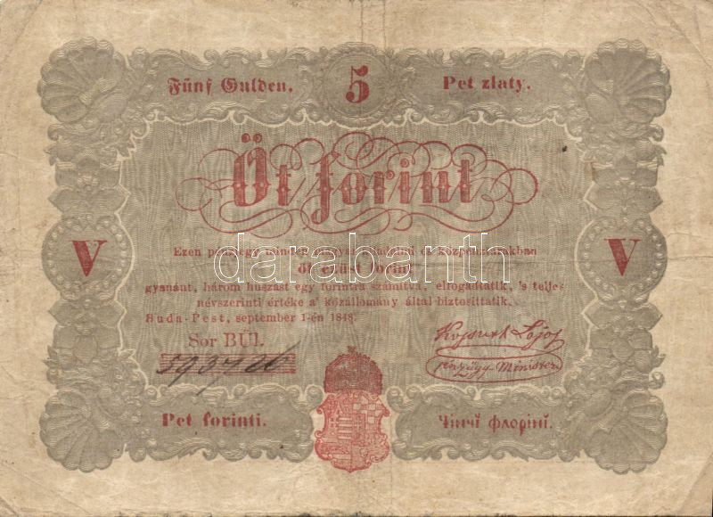 1848. 5Ft "Kossuth bankó" vörösbarna, ritkább hátlapi második sorban é... https://www.darabanth.com/hu/82-Gyorsarveres/82.0/Numizmatika/Osztrakmagyar-magyar-es-magyar-vonatkozasu-bankjegyek~248/1848-5Ft-Kossuth-banko-vorosbarna-ritkabb-hatlapi-masodik-sorban-ekezet-plus-ekezet-roman-~II172865