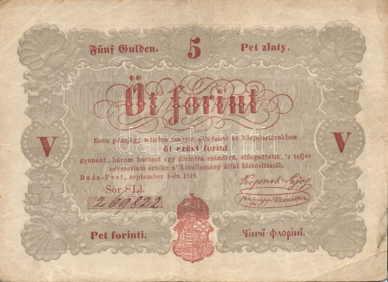 1848. 5Ft "Kossuth bankó" vörösbarna, ritkább hátlapi második sorban é... https://www.darabanth.com/hu/82-Gyorsarveres/82.0/Numizmatika/Osztrakmagyar-magyar-es-magyar-vonatkozasu-bankjegyek~248/1848-5Ft-Kossuth-banko-vorosbarna-ritkabb-hatlapi-masodik-sorban-ekezet-plus-ekezet-roman-~II172866
