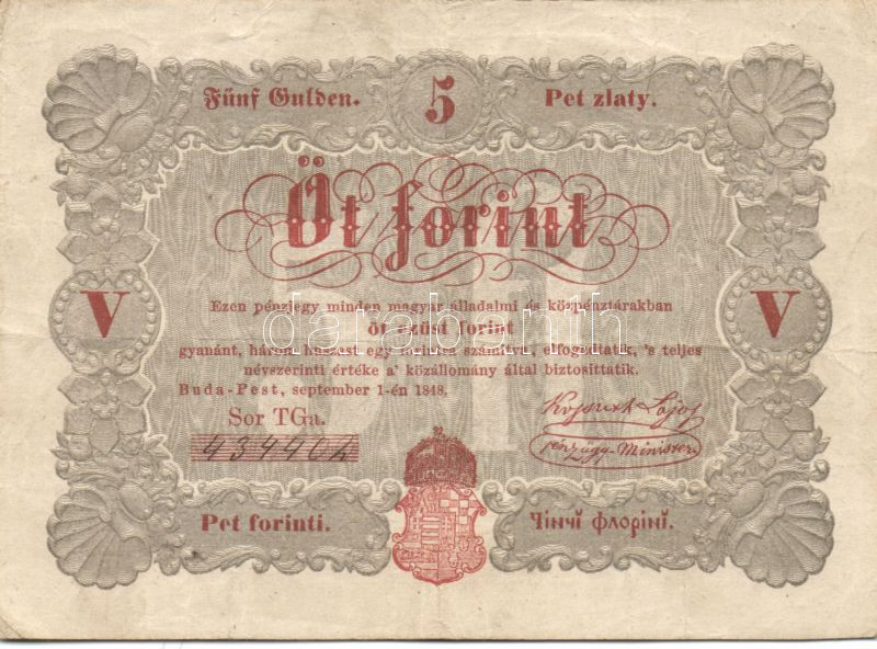 1848. 5Ft "Kossuth bankó" vörösbarna, ritkább hátlapi második sorban é... https://www.darabanth.com/hu/82-Gyorsarveres/82.0/Numizmatika/Osztrakmagyar-magyar-es-magyar-vonatkozasu-bankjegyek~248/1848-5Ft-Kossuth-banko-vorosbarna-ritkabb-hatlapi-masodik-sorban-ekezet-plus-ekezet-roman-~II172867