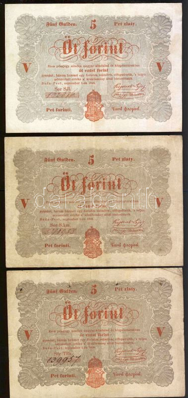 Leírás: 1848. 5Ft "Kossuth bankó" vörösbarna, ritkább hátlapi második sorban ékezet + ékezet román nyelvű variánssal (3x) T:restaurált, ill. III/IV