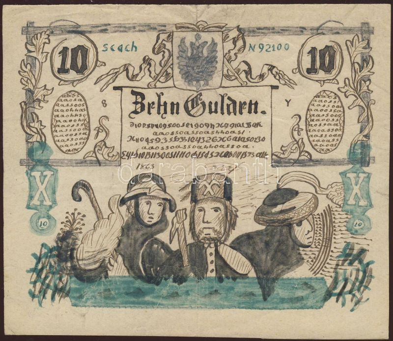 1863. 10G érdekes kézzel festett hamisítványa vízjeles papíron, hátoldalon piros "Falsificat / Gänzlich misslungen sub Z. 2805/4 1873" + zöld körbélyegző "Királyi Törvényszék-Pesten" T:II-