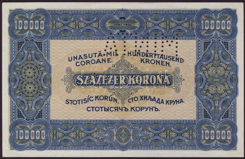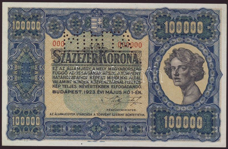 Leírás: 1923. 100.000K "000" szériás "MINTA" lyukasztással "Orell Füssli" T:I RR!!