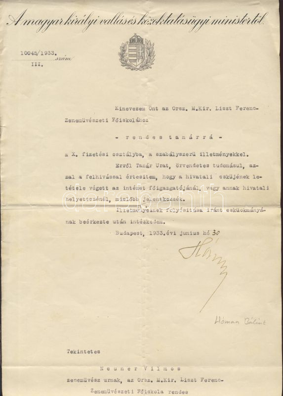 Leírás: 1933 Hóman Bálint aláírása levélen