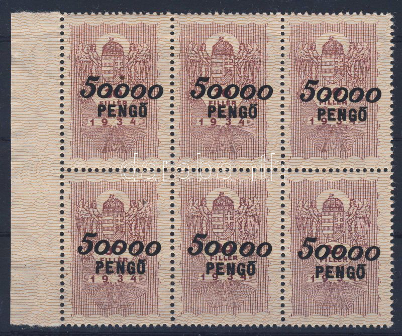 Leírás: 1946 50000 pengő / 30f okmánybélyeg ívszéli hatostömb