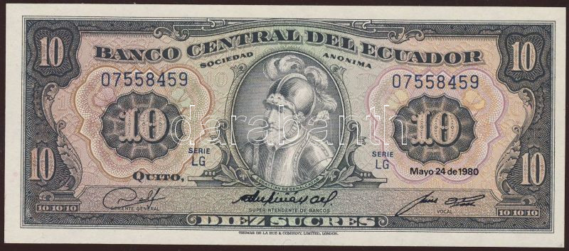 Ekvádor 1980.5.24. 10S T:I https://www.darabanth.com/hu/83-Gyorsarveres/83.0/Numizmatika/Kulfoldi-bankjegyek~5081/Ekvador-1980524-10S-TI~II174657
