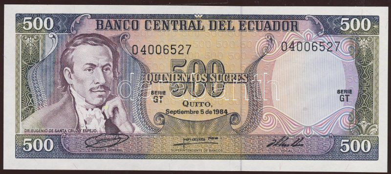 Ekvádor 1984.9.5. 500S T:I https://www.darabanth.com/hu/83-Gyorsarveres/83.0/Numizmatika/Kulfoldi-bankjegyek~5081/Ekvador-198495-500S-TI~II174644