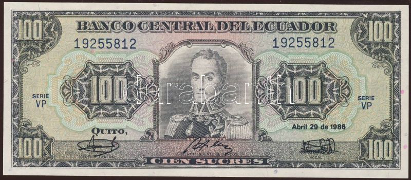 Ekvádor 1986.4.29. 100S T:I https://www.darabanth.com/hu/83-Gyorsarveres/83.0/Numizmatika/Kulfoldi-bankjegyek~5081/Ekvador-1986429-100S-TI~II174648