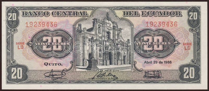 Ekvádor 1986.4.29. 20S T:I https://www.darabanth.com/hu/83-Gyorsarveres/83.0/Numizmatika/Kulfoldi-bankjegyek~5081/Ekvador-1986429-20S-TI~II174654