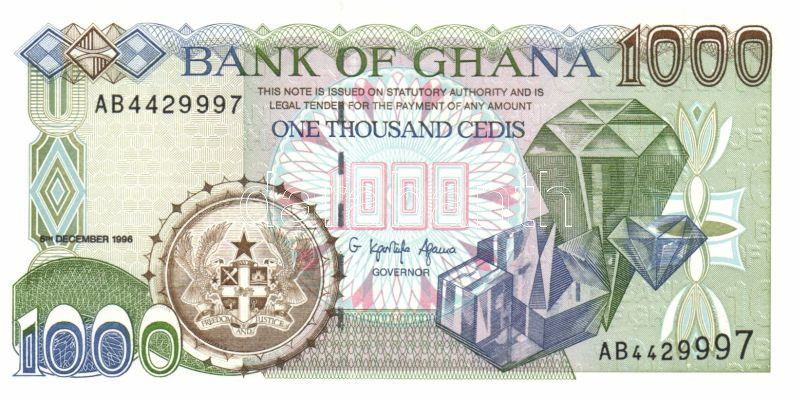 Ghana 1996.12.5. 1000C T:I https://www.darabanth.com/hu/83-Gyorsarveres/83.0/Numizmatika/Kulfoldi-bankjegyek~5081/Ghana-1996125-1000C-TI~II174708