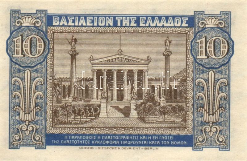 Görögország 1940. 10Dr T:I https://www.darabanth.com/hu/83-Gyorsarveres/83.0/Numizmatika/Kulfoldi-bankjegyek~5081/Gorogorszag-1940-10Dr-TI~II174718