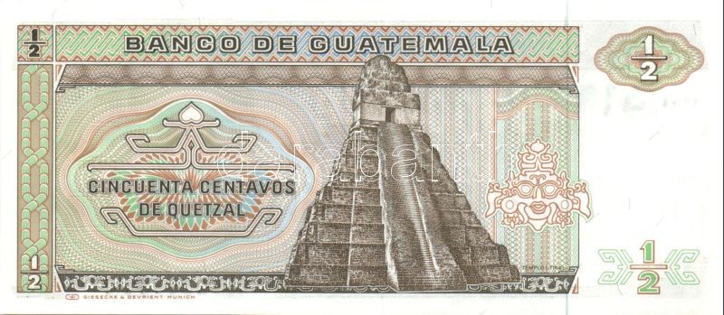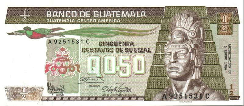 Guatemala 1986.1.3. 1/2Q T:I https://www.darabanth.com/hu/83-Gyorsarveres/83.0/Numizmatika/Kulfoldi-bankjegyek~5081/Guatemala-198613-12Q-TI~II174720