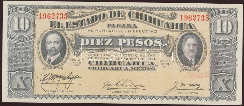 Mexikó /Chihuahua 1915. 10P T:I https://www.darabanth.com/hu/83-Gyorsarveres/83.0/Numizmatika/Kulfoldi-bankjegyek~5081/Mexiko-Chihuahua-1915-10P-TI~II177255