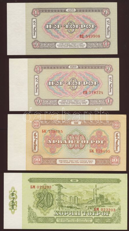 Mongólia 1966, 1981-83. 1T(1966), 1T(1983), 10T(1981), 20T(1981) T:I https://www.darabanth.com/hu/83-Gyorsarveres/83.0/Numizmatika/Kulfoldi-bankjegyek~5081/Mongolia-1966-1981-83-1T1966-1T1983-10T1981-20T1981-TI~II177261