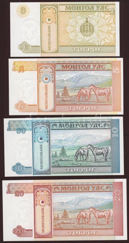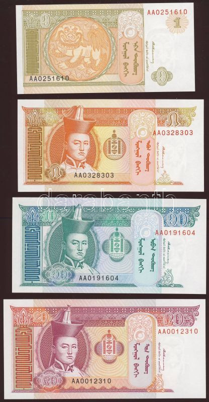 Mongólia 1993. 1T, 5T, 10T, 20T T:I https://www.darabanth.com/hu/83-Gyorsarveres/83.0/Numizmatika/Kulfoldi-bankjegyek~5081/Mongolia-1993-1T-5T-10T-20T-TI~II177262