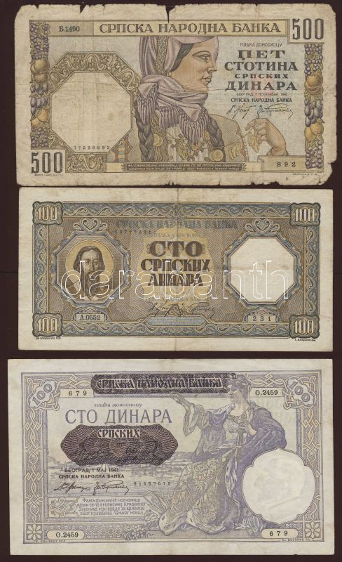 Szerbia/német megszállás 1941. 100D, 500D T:II,IV + 1943. 100D T:II/II... https://www.darabanth.com/hu/83-Gyorsarveres/83.0/Numizmatika/Kulfoldi-bankjegyek~5081/Szerbianemet-megszallas-1941-100D-500D-TII-IV-plus-1943-100D-TIIIII~II175160