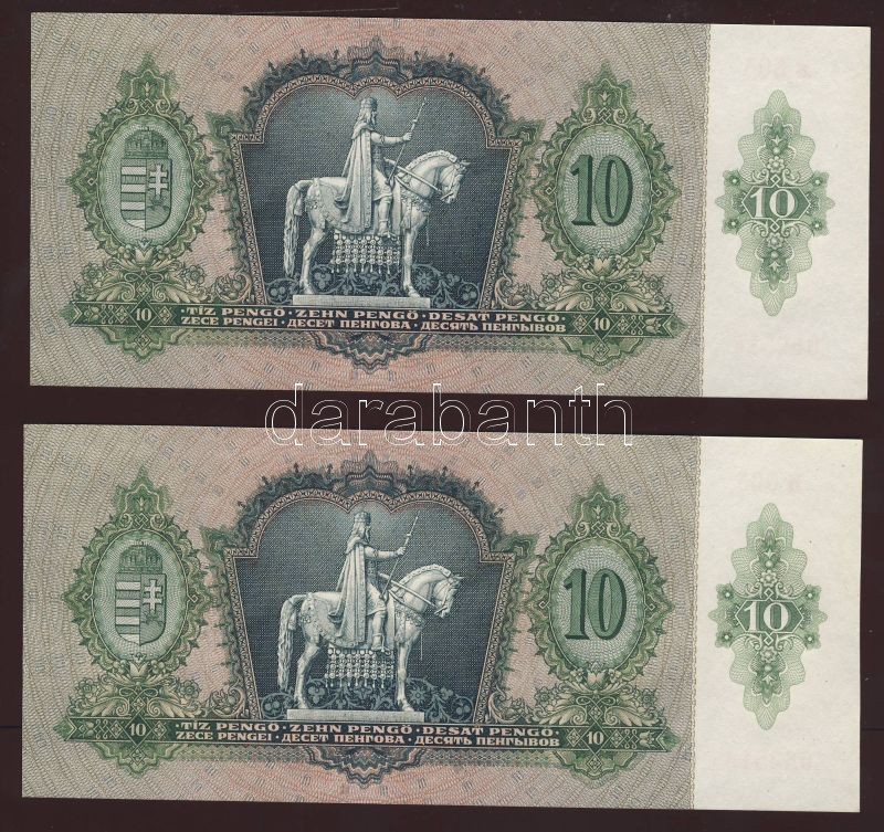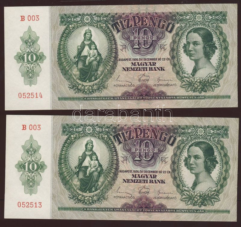 1936. 10P (2x) egymásutáni sorszámmal T:I https://www.darabanth.com/hu/83-Gyorsarveres/83.0/Numizmatika/Osztrakmagyar-magyar-es-magyar-vonatkozasu-bankjegyek~5080/1936-10P-2x-egymasutani-sorszammal-TI~II174682