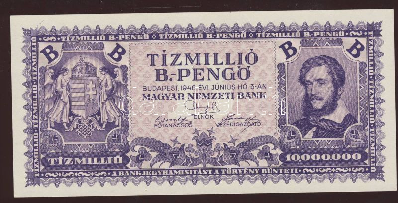 1946. 10.000.000B.-pengő T:I https://www.darabanth.com/hu/83-Gyorsarveres/83.0/Numizmatika/Osztrakmagyar-magyar-es-magyar-vonatkozasu-bankjegyek~5080/1946-10000000B-pengo-TI~II174683