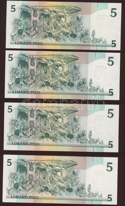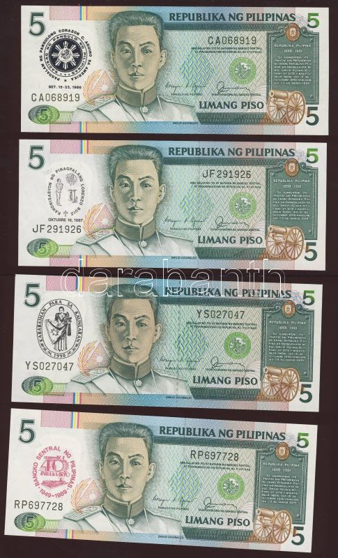 Fülöp szigetek 1986-91. 5P (4x) emlékkiadások, mind klf felülnyomással... https://www.darabanth.com/hu/84-Gyorsarveres/84.0/Numizmatika/Kulfoldi-bankjegyek~327/Fulop-szigetek-1986-91-5P-4x-emlekkiadasok-mind-klf-felulnyomassal-TI~II177642