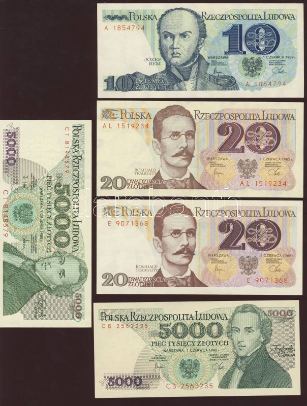 Leírás: Lengyelország 1982. 10Zl, 20Zl (2x) klf sorozatbetű, 5000Zl (2x) klf dátummal T:I