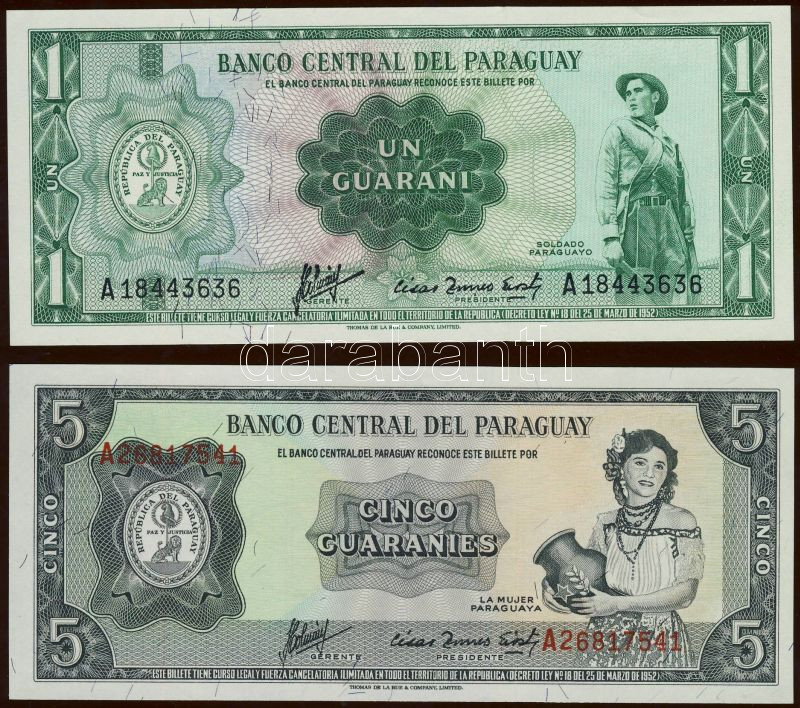 Paraguay 1952(1963). 1G, 5G T:I https://www.darabanth.com/hu/84-Gyorsarveres/84.0/Numizmatika/Kulfoldi-bankjegyek~327/Paraguay-19521963-1G-5G-TI~II178219