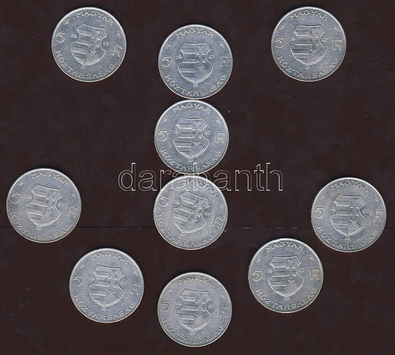 1947. 5Ft Ag (10x) "Kossuth" T:2,2/3 https://www.darabanth.com/hu/84-Gyorsarveres/84.0/Numizmatika/Magyar-es-magyar-verdejelu-fem-es-ezustpenzek~322/1947-5Ft-Ag-10x-Kossuth-T2-23~II179179