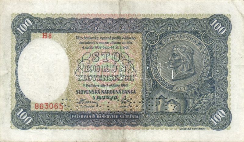 Leírás: Szlovákia 1940. 100K "Minta" lyukasztással T:II-