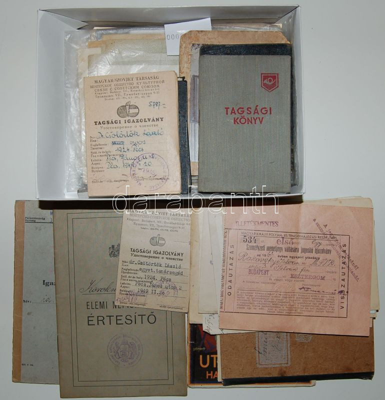 Leírás: Igazolványok, bizonyítványok, levelek, nyomtatványok kis tétel 1900-1980-ig