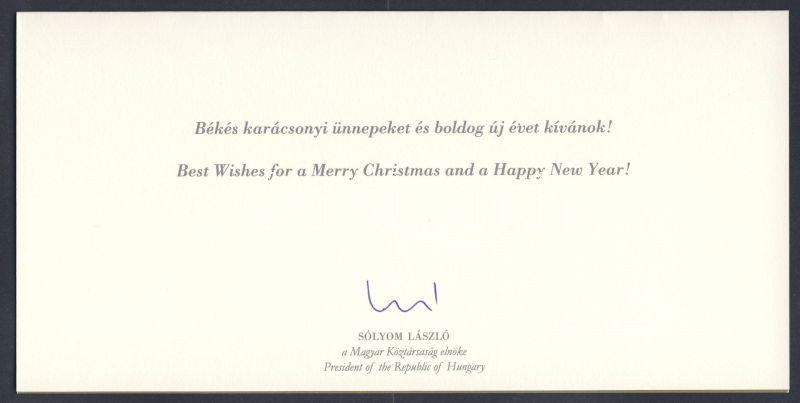 Sólyom László köztársasági elnök aláírása üdvözlőlapon https://www.darabanth.com/hu/87-Gyorsarveres/87.0/Festmeny-mutargy-papirregiseg-egyeb/Alairas-Signature~313/Solyom-Laszlo-koztarsasagi-elnok-alairasa-udvozlolapon~II189885