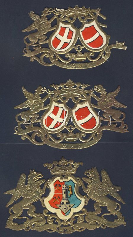 Leírás: 3 db aranyozott színezett díszes címer kartonból az egyik sérült