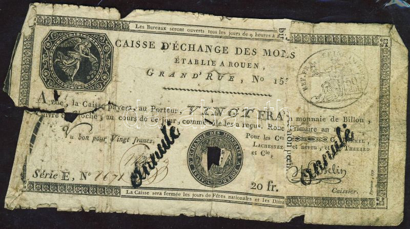 Franciaország / Rouen 1797-1803. 20Fr T:IV- R! https://www.darabanth.com/hu/89-Gyorsarveres/89.0/Numizmatika/Kulfoldi-bankjegyek~1404/Franciaorszag-Rouen-1797-1803-20Fr-TIV-R~II187726
