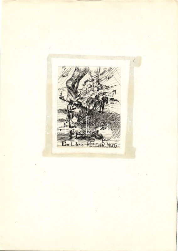 Leírás: Ex-libris azonosítatlan szignóval; toll, papír 9x12cm