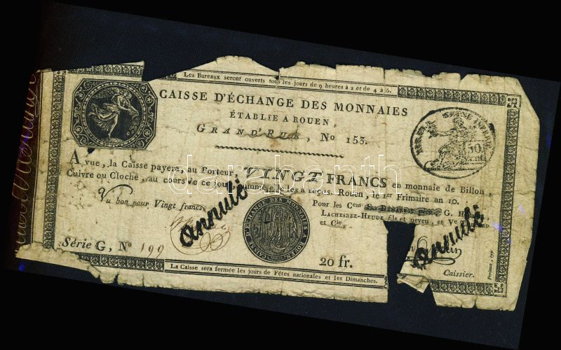 Franciaország / Rouen 1797-1803. 20Fr T:IV- R! https://www.darabanth.com/hu/92-Gyorsarveres/92.0/Numizmatika/Kulfoldi-bankjegyek~296/Franciaorszag-Rouen-1797-1803-20Fr-TIV-R~II187716