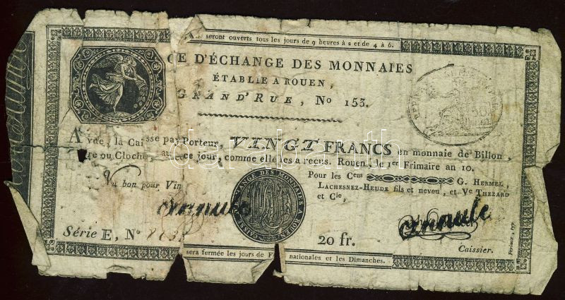 Franciaország / Rouen 1797-1803. 20Fr T:IV- R! https://www.darabanth.com/hu/92-Gyorsarveres/92.0/Numizmatika/Kulfoldi-bankjegyek~296/Franciaorszag-Rouen-1797-1803-20Fr-TIV-R~II187727