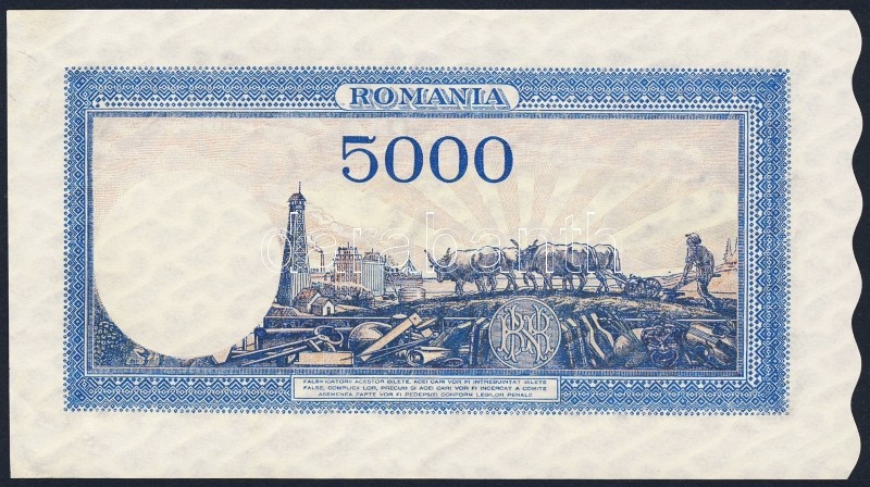 Románia 1945. 5000L T:II+ https://www.darabanth.com/hu/92-Gyorsarveres/92.0/Numizmatika/Kulfoldi-bankjegyek~296/Romania-1945-5000L-TIIplus~II207004