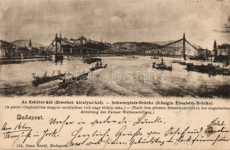 1900 Budapest Queen Elisabeth-bridge (fl) (EK) https://www.darabanth.com/hu/93-Gyorsarveres/93.0/Kepeslapok/Magyarorszag-Hungary~5208/1900-Budapest-Queen-Elisabeth-bridge-fl-EK~II208912