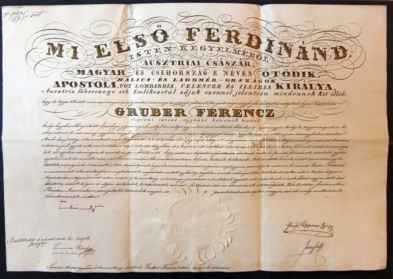 1847 Őrkanonoki címet adományozó okirat Gruber Ferenc soproni kanonok részére. V. Ferdinánd király, ill. gróf Apponyi György és Jászay Pál saját kezű aláírásaival / Prebendial appointing charter with own-handed autograph of emperor Ferdinand V., duke Apponyi György, and Jászay Pál