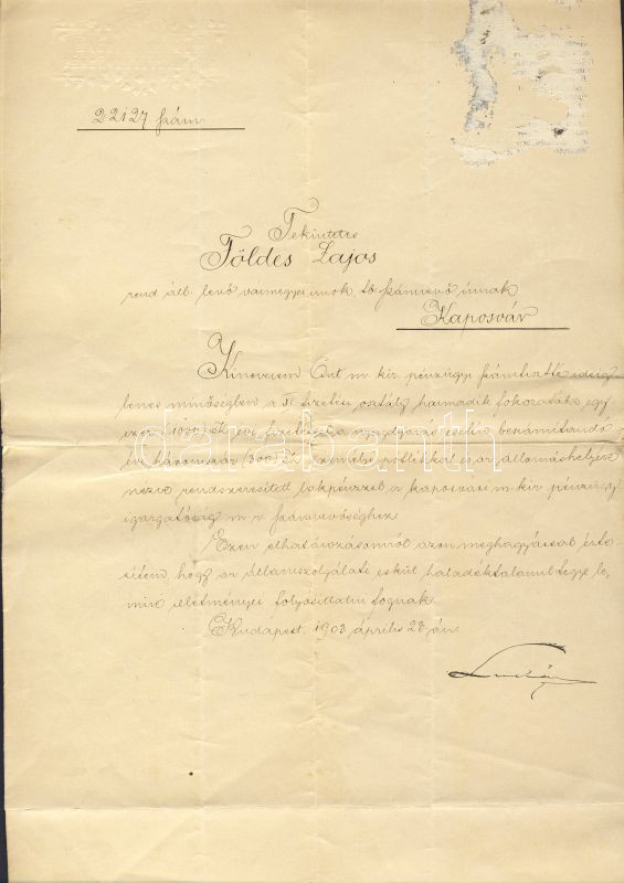 Leírás: 1903 Lukács László miniszterelnök aláírása levélen