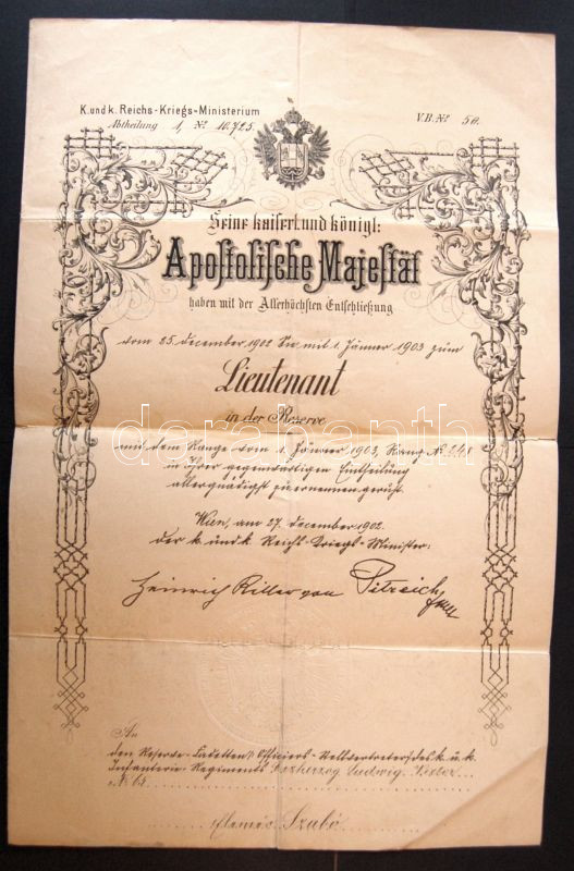 1903 díszes k.u.k. hadnagyi kinevezés Lázár Andor, honvéd államtitkár, későbbi igazságügyminiszter aláírásával / Decorative lutenant appointing charter with the signature of the latter minister of justice Andor Lázár