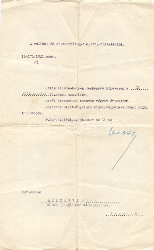 Leírás: 1921 Vass József vallási és közoktatási miniszter aláírása levélen