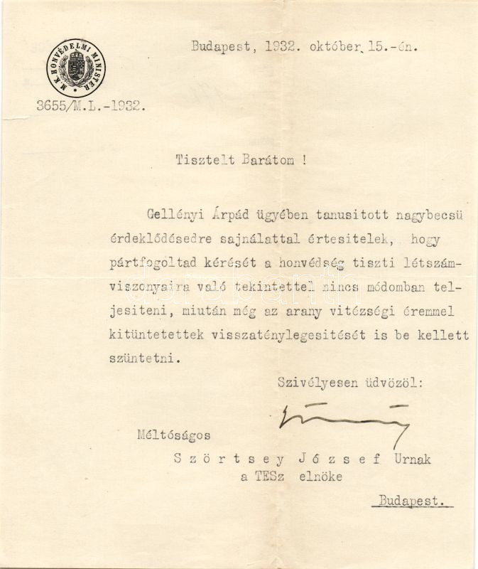 Leírás: 1932 Gömbös Gyula honvédelmi miniszter, későbbi miniszterelnök által aláírt levél