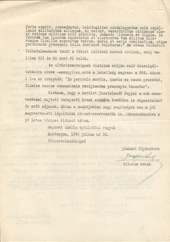 Leírás: 1944 Serédi Jusztinián hercegprímás által aláírt levél