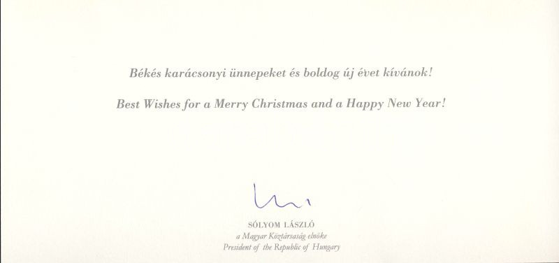 Leírás: Sólyom László köztársasági elnök aláírása üdvözlő kártyán