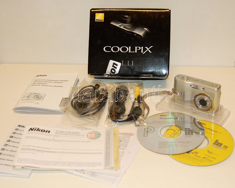 Nikon Coolpix L11 típusú digitális fényképezőgép minden tartozékkal kábelekkel, eredeti dobozban alig használtan (a gép LCD kijelzője törés miatt nem működik, egyébként működőképes)